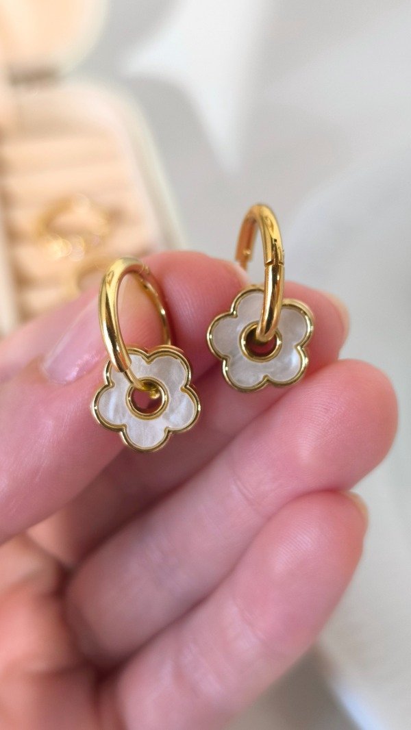 Argollas en Acero Dorado diseño flor blanca colgante, hermosas para todos los días 🌸