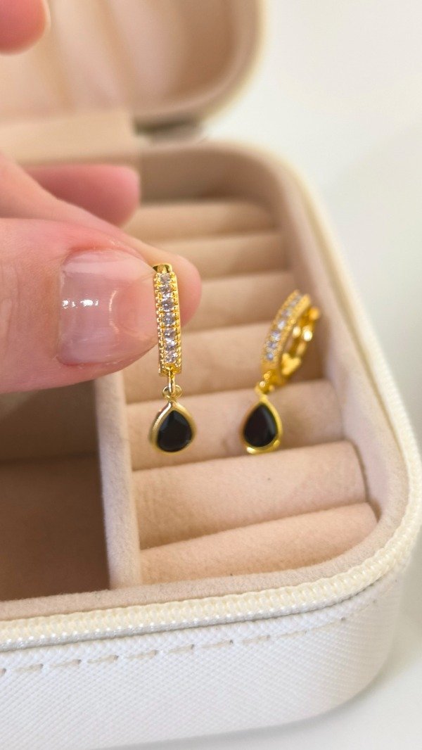 Argollas en Acero dorado diseño elegante, con incrustaciones de strass y colgante en gota negro, resaltan en cualquier ocasión! 🖤