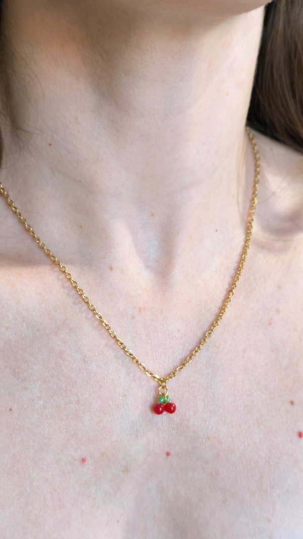 Collar diseño Artesanal cereza, en Acero Dorado, con un largo de 45 cm 🍒