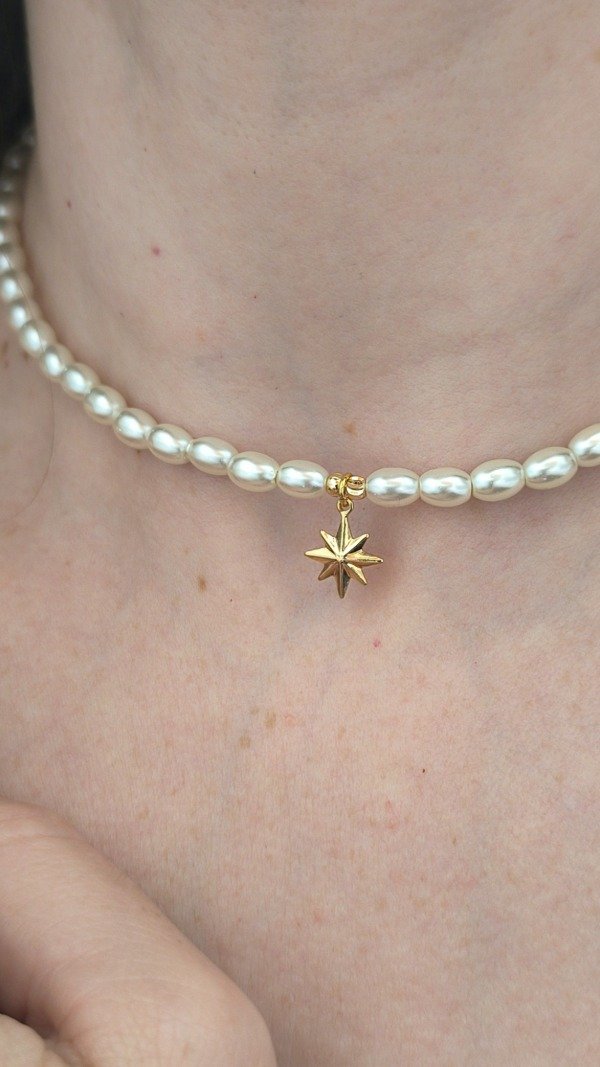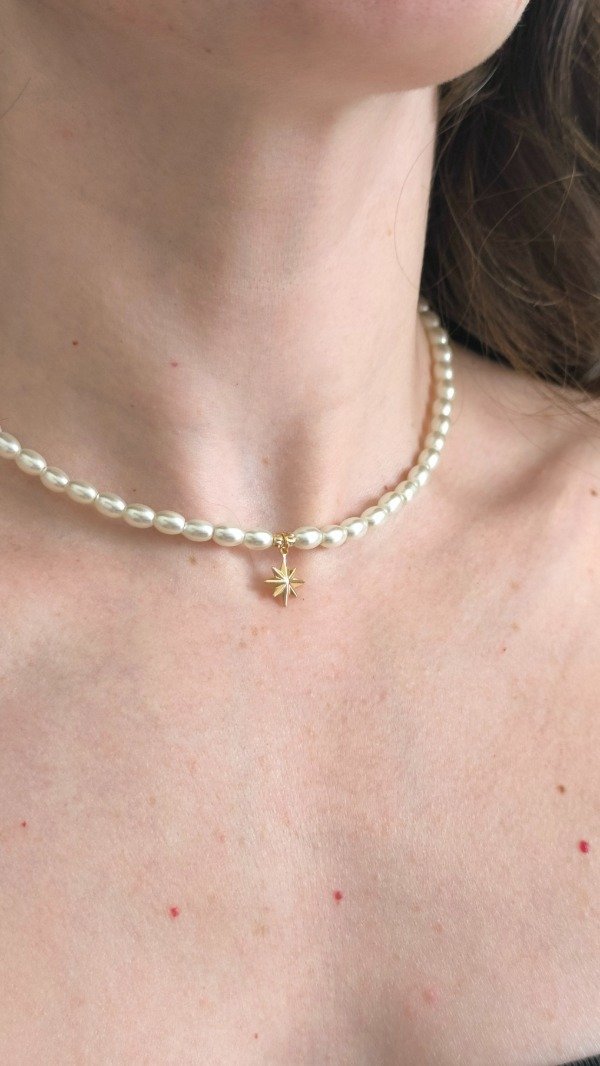 Collar diseño artesanal, un diseño delicado que suma perlas premium alargadas con detalles y dije destello en material GoldFilled.