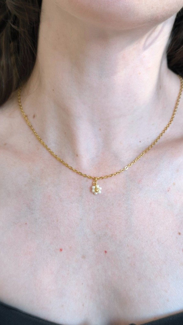 Collar Diseño Artesanal Margarita, con cadena en acero Dorado de 45 cm y dije artesanal de perlas sintéticas y centro de Goldfilled.