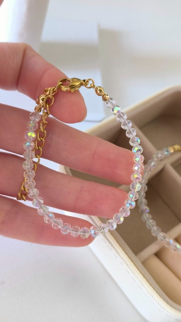 Pulsera Diseño Artesanal con Cristales de Roca Traslúcidos tornasolados , una hermosa combinación que junto con el Acero Dorado resaltan en cualquier lugar ✨