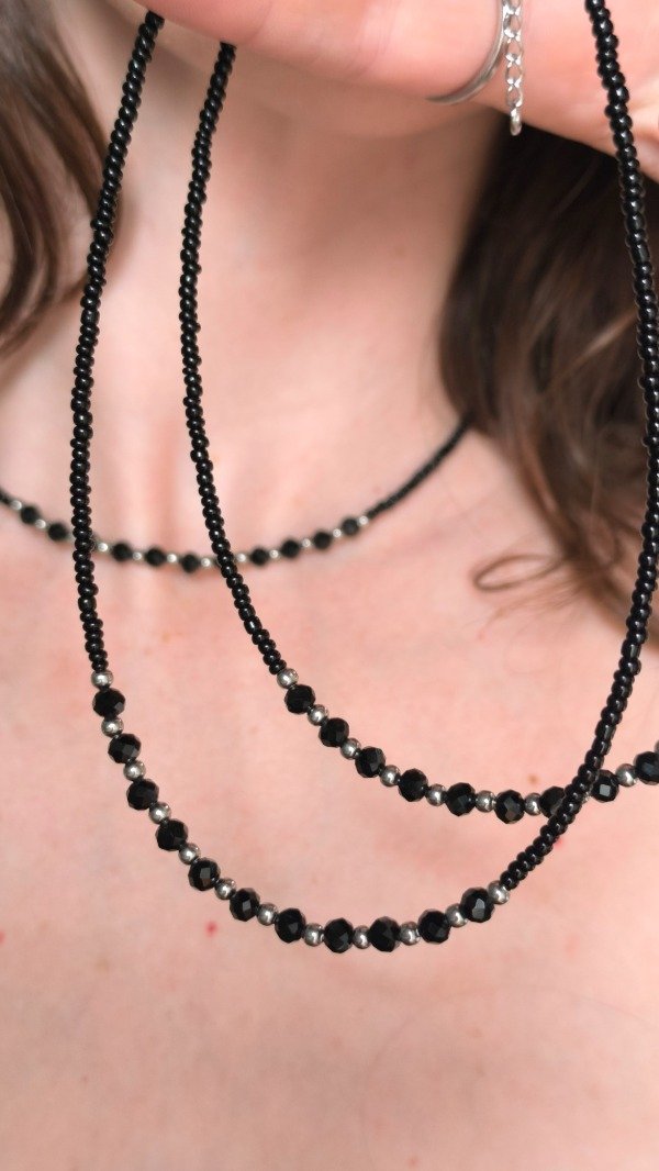 Choker diseño artesanal realizado en mostacillas y cristales de Roca , con balines de separación, terminaciones y prolongación de cadena todo en Acero quirúrgico 🌸