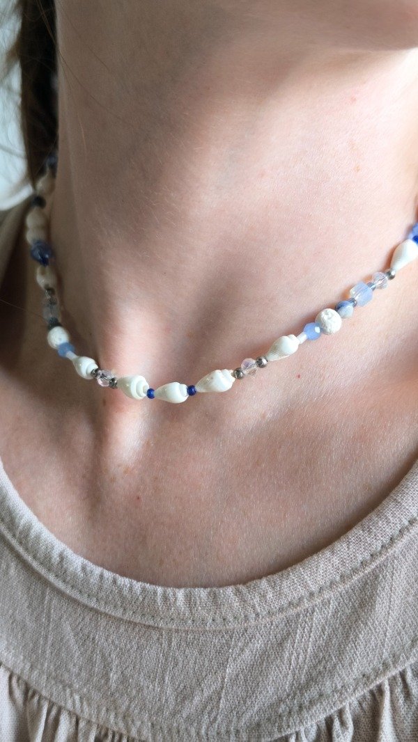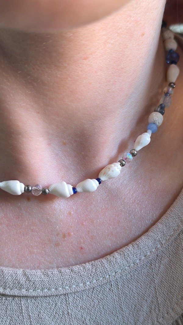 Acero quirúrgico, cristales de Roca, mostacillas, caracoles, y una combinación de Piedra Natural Volcánica blanca y Sodalita, dando una pieza equilibrada que combina la Fuerza del fuego con la calma mental, dos energías complementarias.