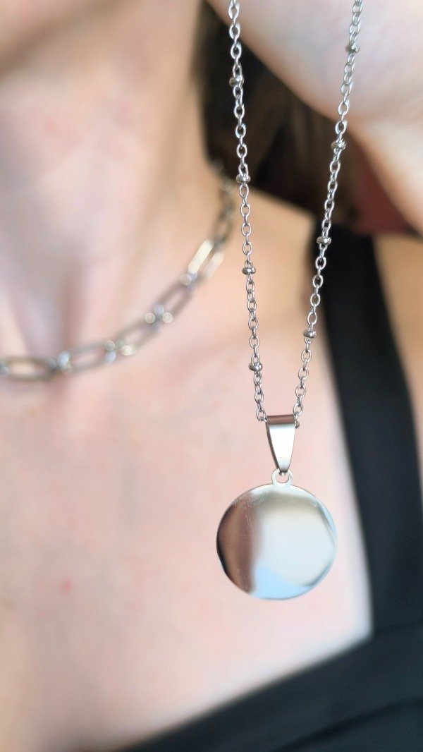 Collar diseño en Acero Quirúrgico cadena con detalles de bolitas, y dije circular con un largo de 45 cm es Hipoalergénica y resistente al agua 💧 Realza todos los looks, combinala con otras cadenas o chokers y resalta en cualquier lugar ✨