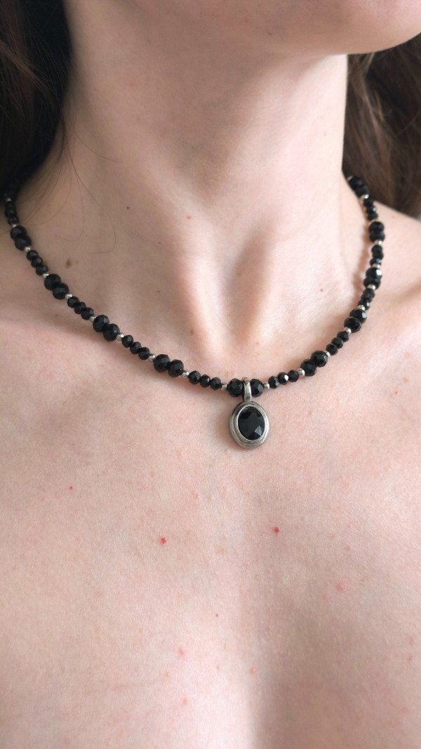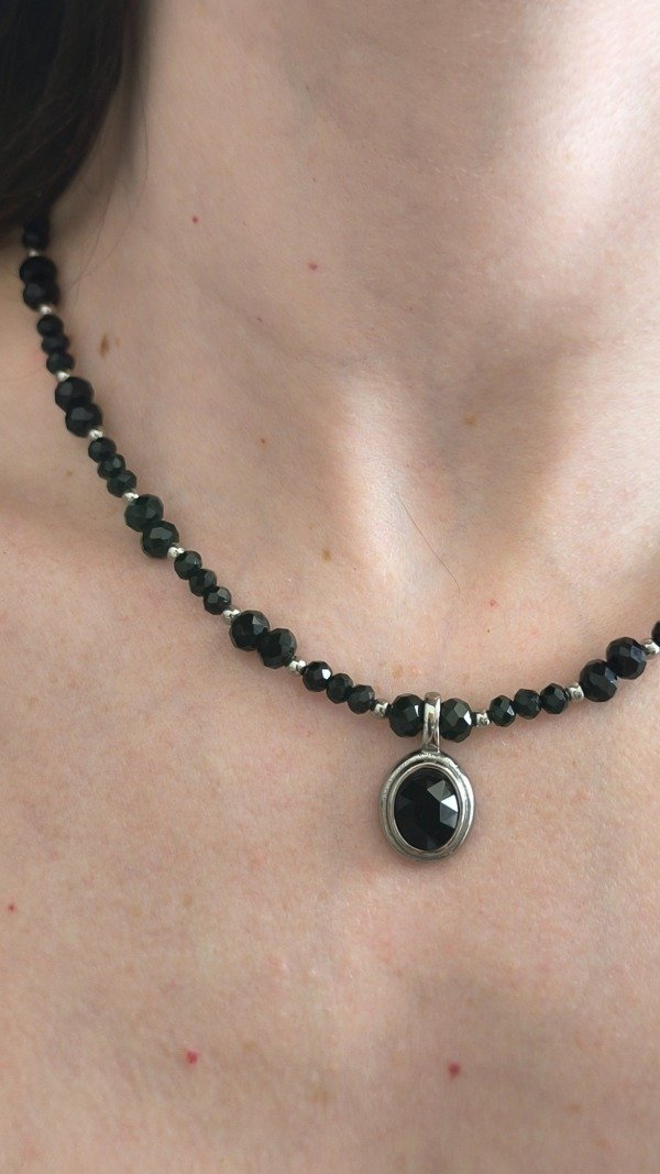 Collar diseño Artesanal combinando cristales de roca negros, separaciones, dije central y terminaciones en Acero Quirúrgico.