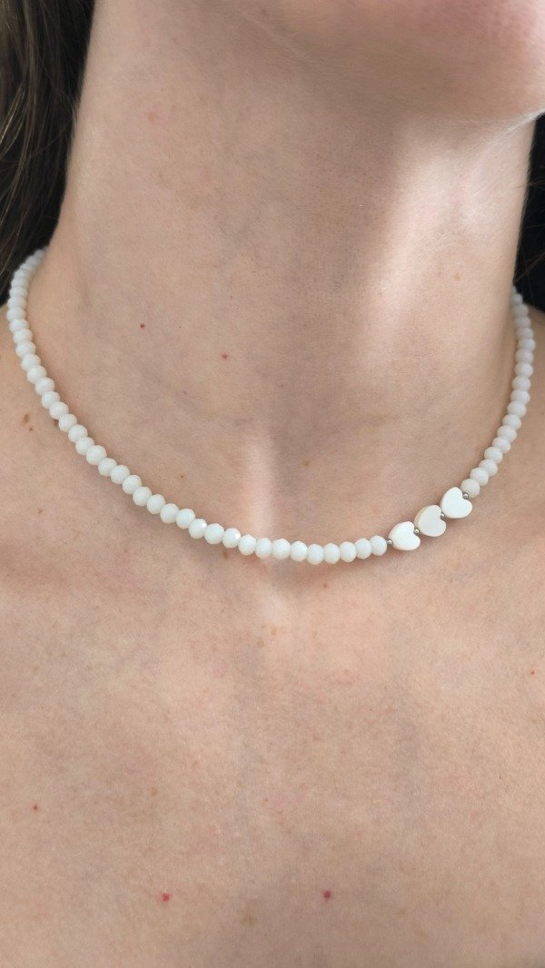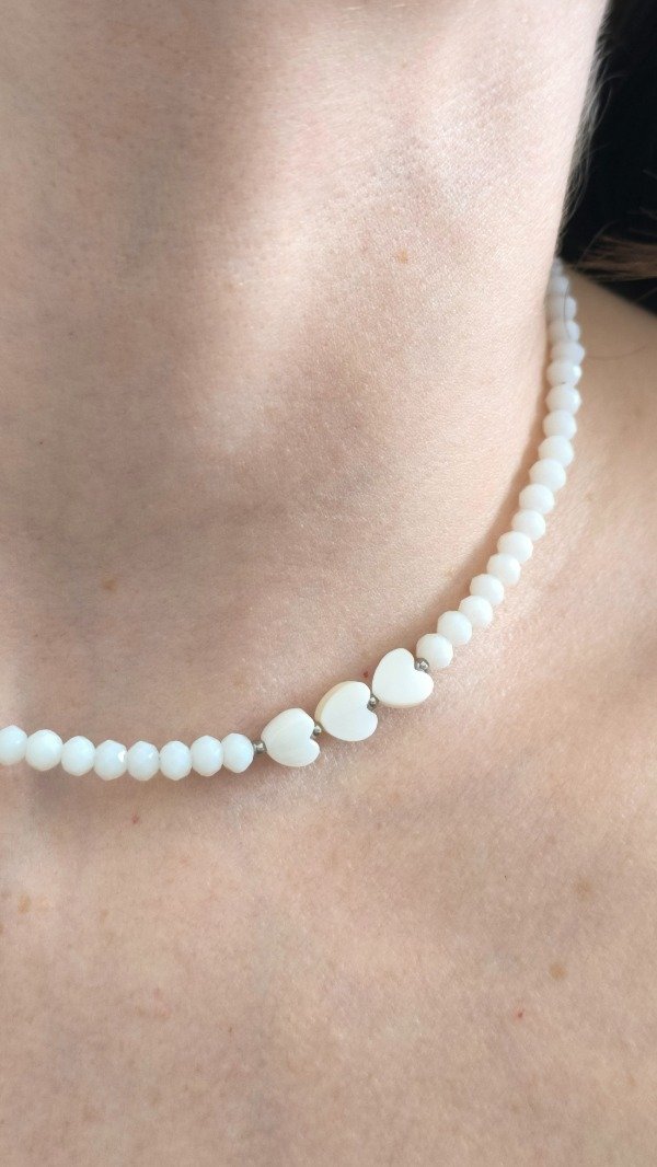 Collar diseño Artesanal que combina cristales de roca blancos con pasantes en Nacar de corazón, un diseño hipoalergénico y resistente al agua 💧 ya que todas sus terminaciones son en Acero quirúrgico!