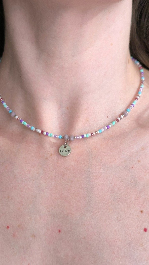 Choker Diseño Artesanal de mostacillas con cristales de Roca, terminaciones y dije en Fundición.