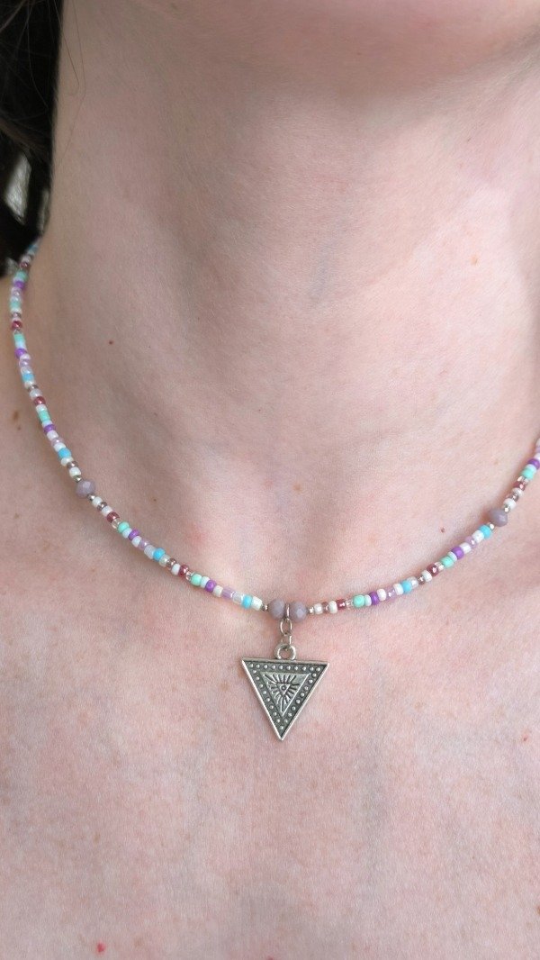 Choker Diseño Artesanal de mostacillas con cristales de Roca, terminaciones y dije en Fundición.