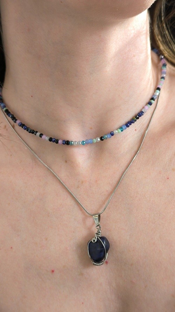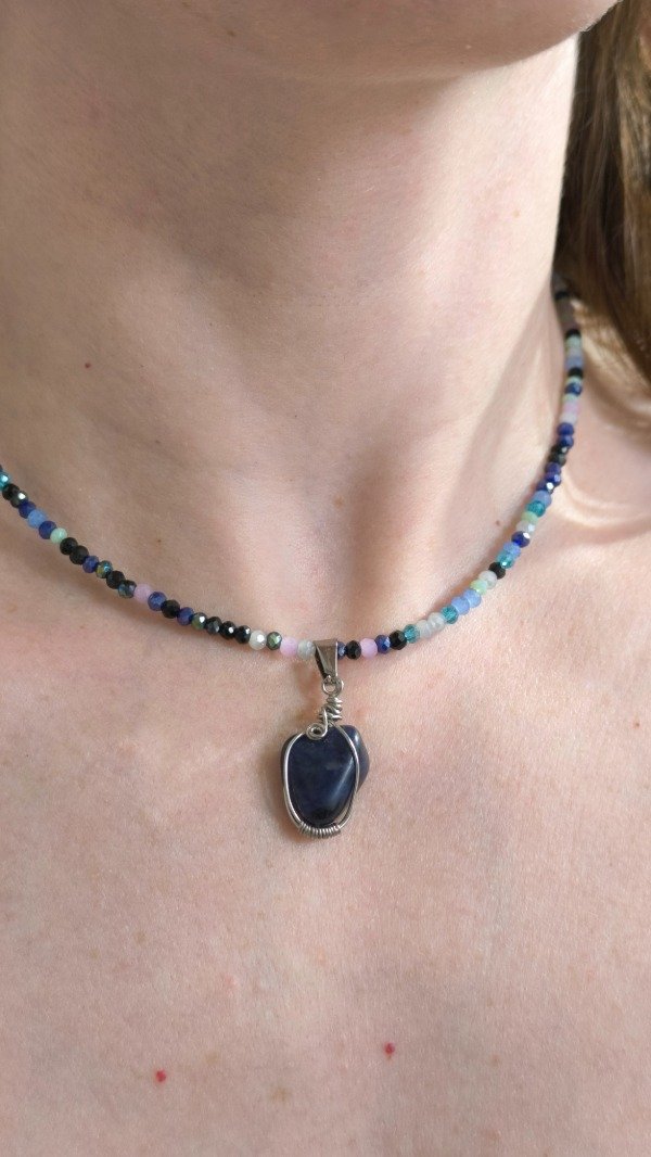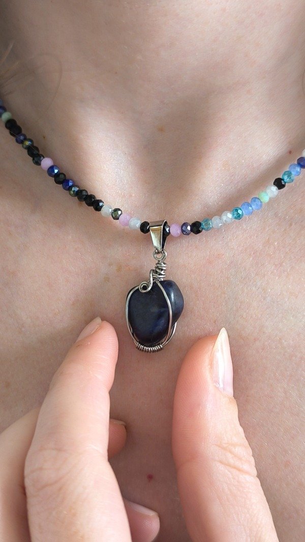 Diseño artesanal único, combina dije realizado con técnica de alambrismo, con alambre de Acero quirúrgico y piedra Sodalita en su interior, el diseño es único ya que todas las piedras son distintas y la forma del dije dependerá de lo que la piedra me permita hacer 🤍 (NO hay dos iguales)