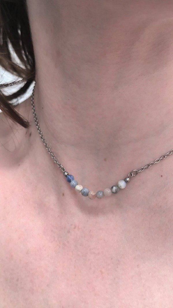 Collar Diseñado de manera Artesanal, modelo exclusivo, con un largo de 35 cm y prolongación de 5 cm para regular su largo, realizado en Acero Quirúrgico con engarces y piedra Naturales Sodalita