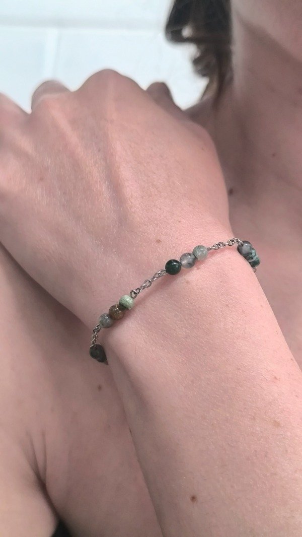 Pulsera Diseñada de manera Artesanal, modelo exclusivo de largo regulable, realizado en Acero Quirúrgico con engarces y piedra Naturales Ágata Musgo