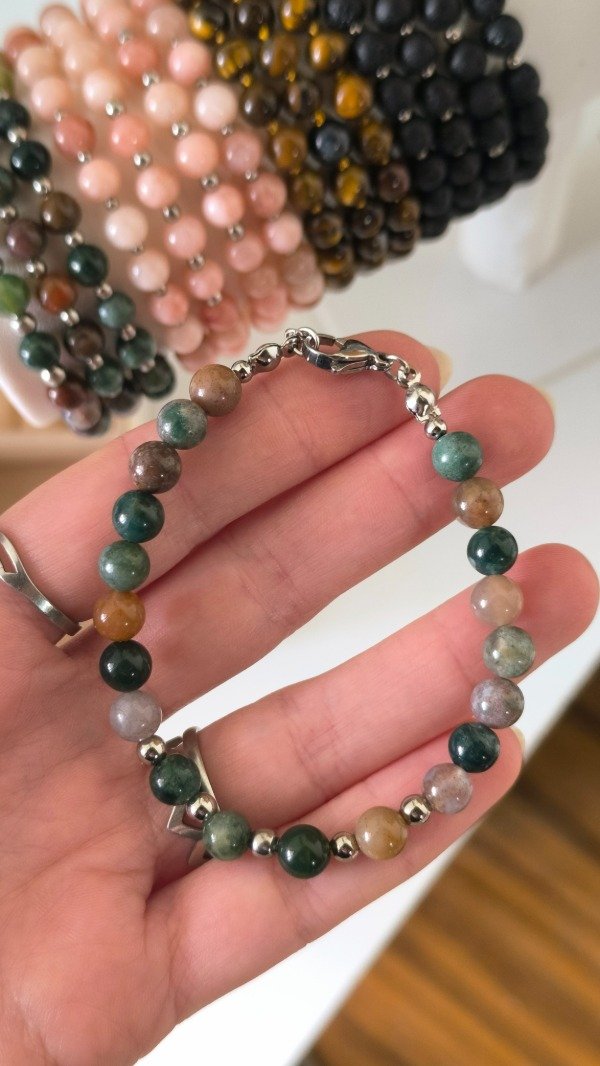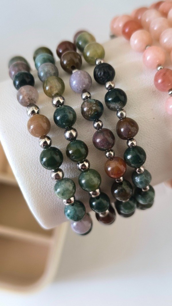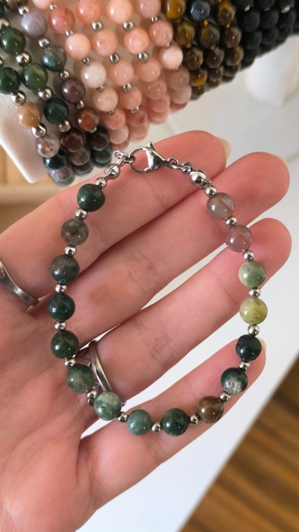 Pulseras enhebradas manualmente con una combinación de piedras Naturales Ágata Musgo y Acero Quirúrgico, lo que las hace hipoalergénicas y resistentes al Agua 💧de todos modos recomiendo quitarlas para exposición prolongada como lo es ducharse, piletas con cloro, o el Mar, protegiendo así el mineral que absorbe agua, y prolongando su durabilidad 🤍