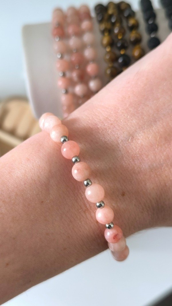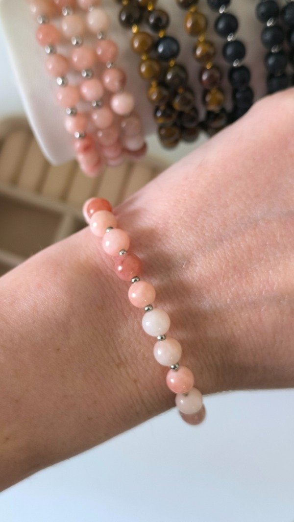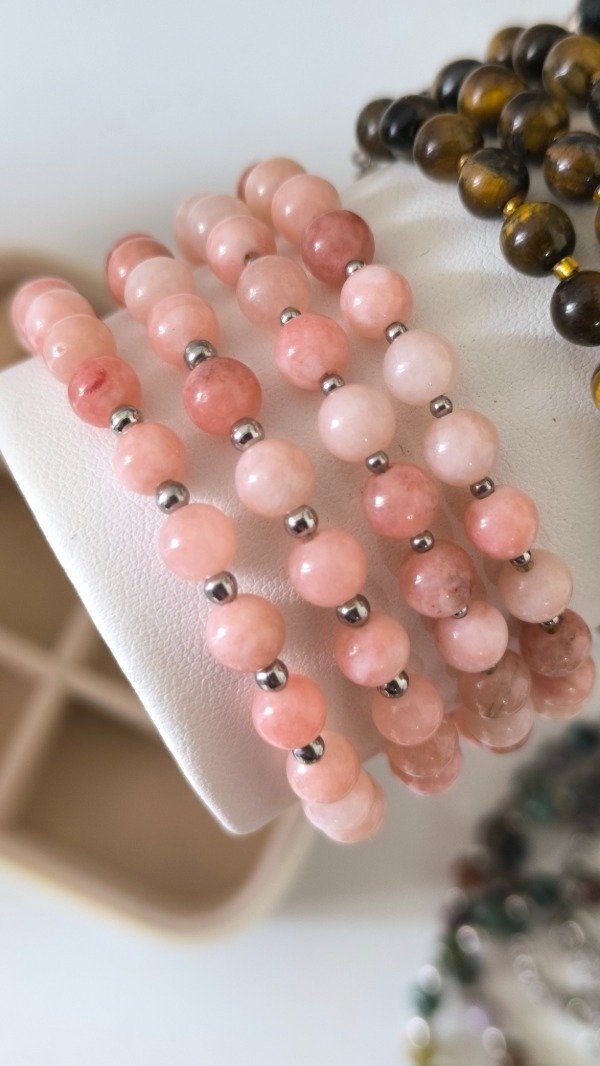 Pulseras enhebradas manualmente con una combinación de piedras Naturales Cuarzo Rosa y Acero Quirúrgico, lo que las hace hipoalergénicas y resistentes al Agua 💧de todos modos recomiendo quitarlas para exposición prolongada como lo es ducharse, piletas con cloro, o el Mar, protegiendo así el mineral que absorbe agua, y prolongando su durabilidad 🤍